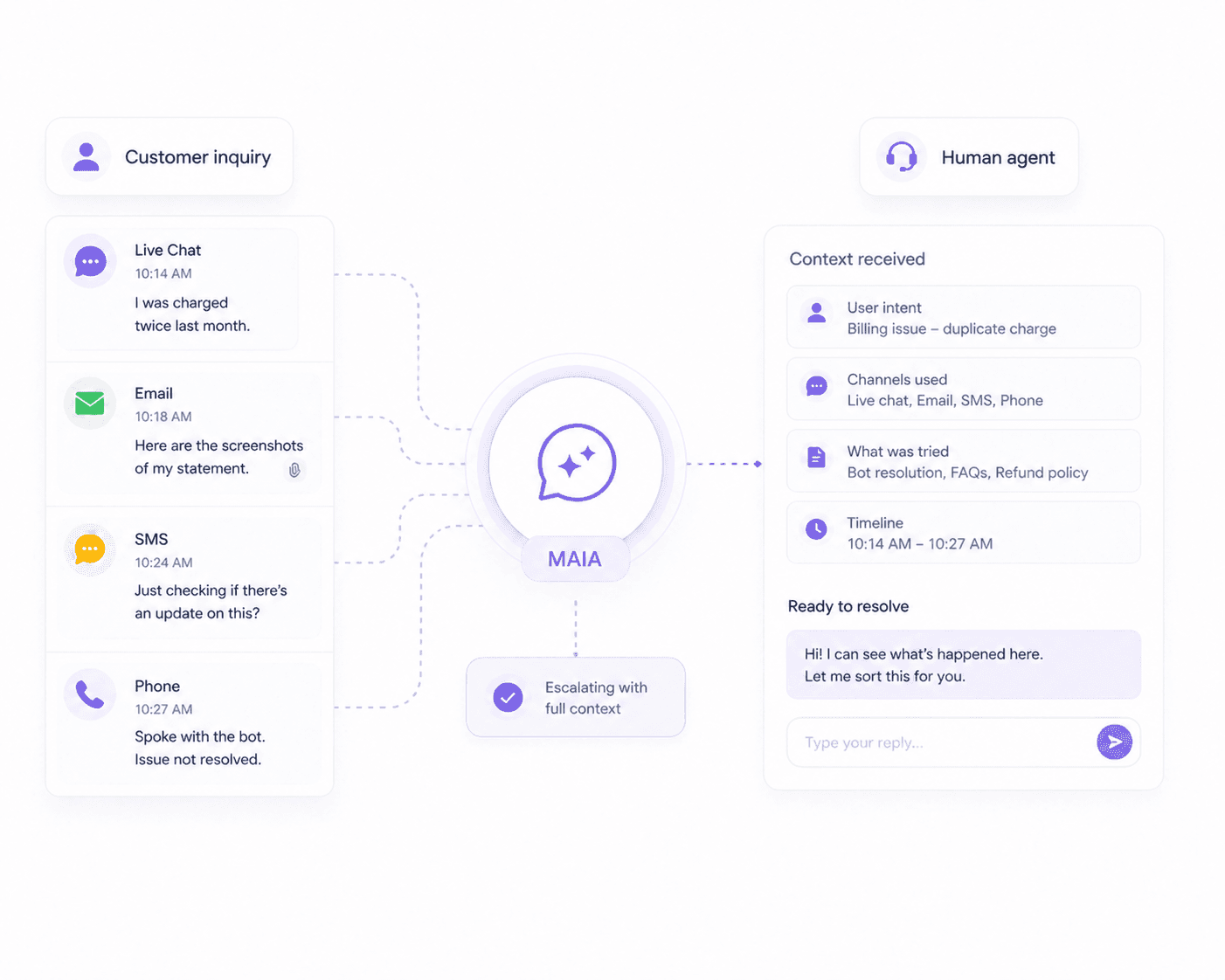When a query needs a human, MAIA doesn't just transfer the call, it transfers everything - channel history, user-intent, what was tried, so agents arrive informed and ready to resolve.
