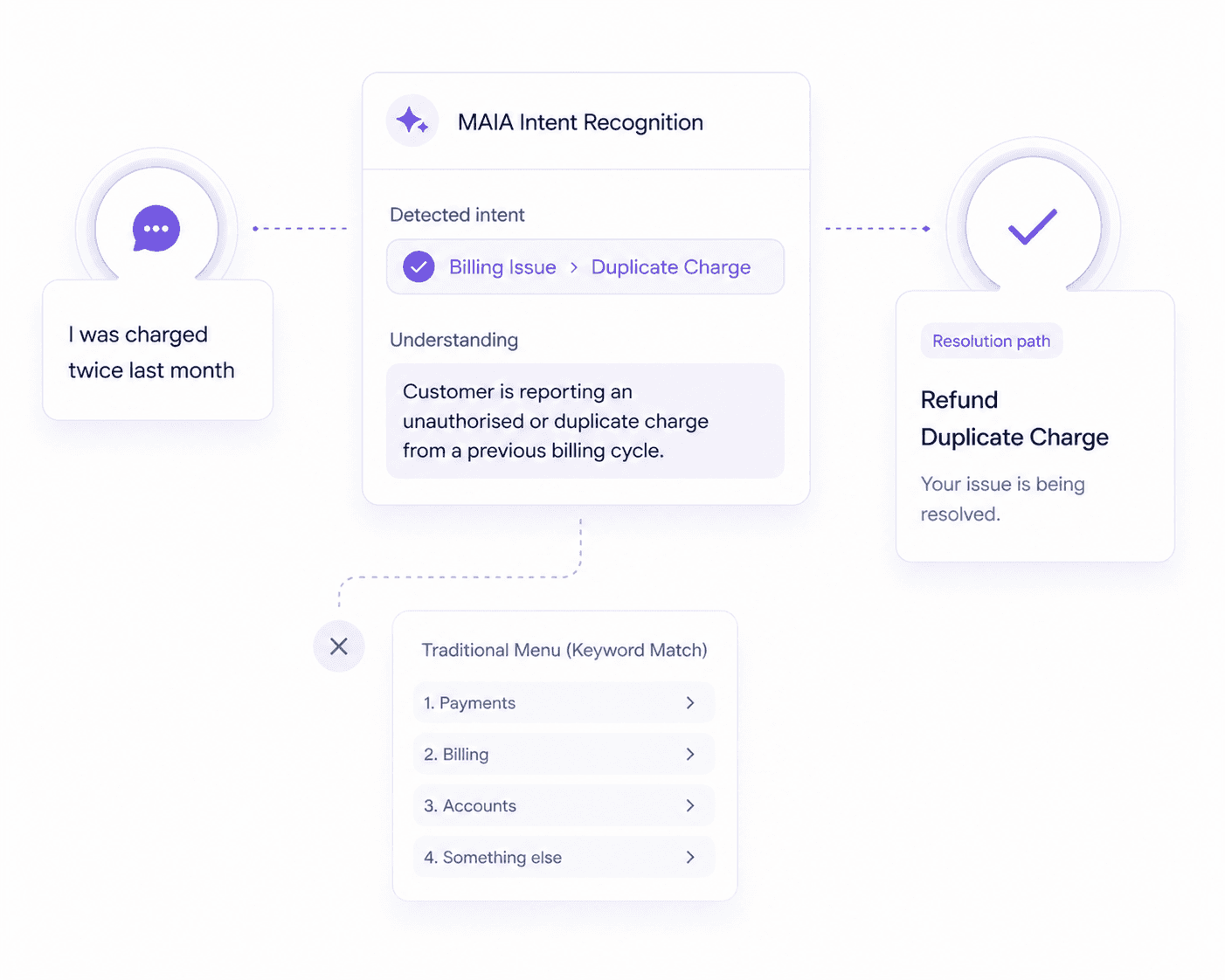 MAIA goes beyond keyword matching. Its intent recognition reads the context behind a query so customers get routed to the right resolution path, not a dead-end menu.